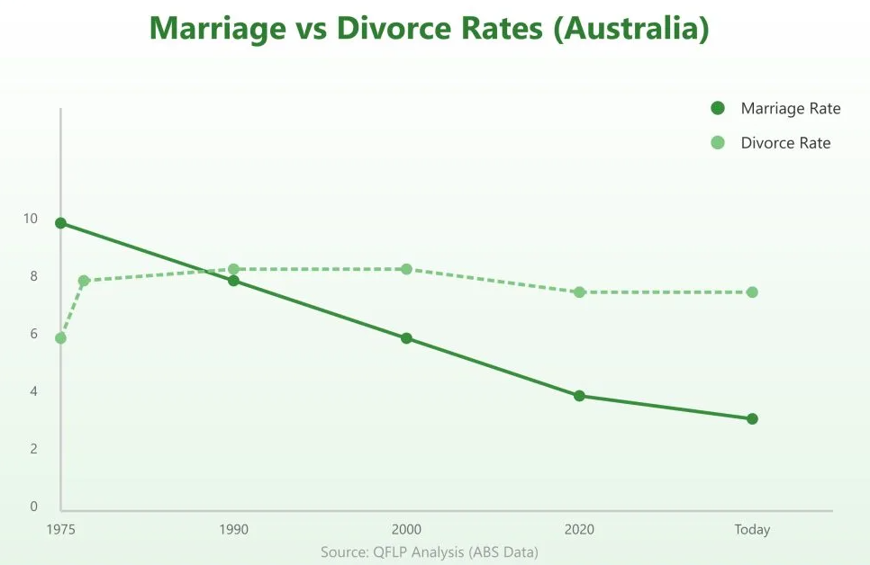 The rate of divorce in Australia has fallen to its lowest levels since the mid-1970s. In 2023, there were 2.3 divorces for every 1,000 residents compared to 6.3 in 1976. More recently getting squeezed by the cost-of-living crunch and in the midst of a housing crisis, research suggests more couples with their differences are staying together in a home they own. Buying or renting most properties is becoming out of reach for average Australians, particularly in the case of single income serviceability for a loan.