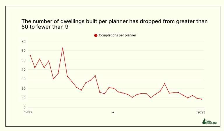 This is some research by the privately funded Yes In My Back Yard (YIMBY) Melbourne Advocacy Group, comparing the growth of the planning workforce with housing delivery data over four decades.