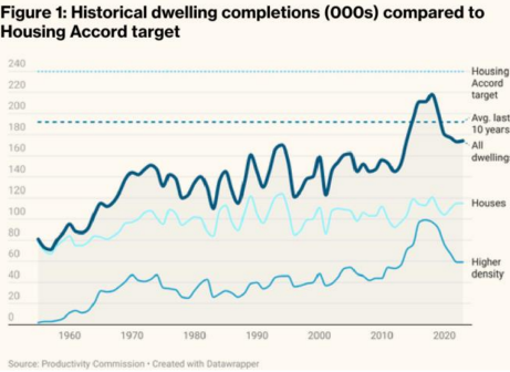 PIA highlights that Australia is not on track to meet the National Housing Accord target of 1.2 million homes by 2029. Among the many factors that are currently choking productivity, it acknowledges that there is a “post-approval bottleneck”, where many projects are yet to/will not reach commencement.